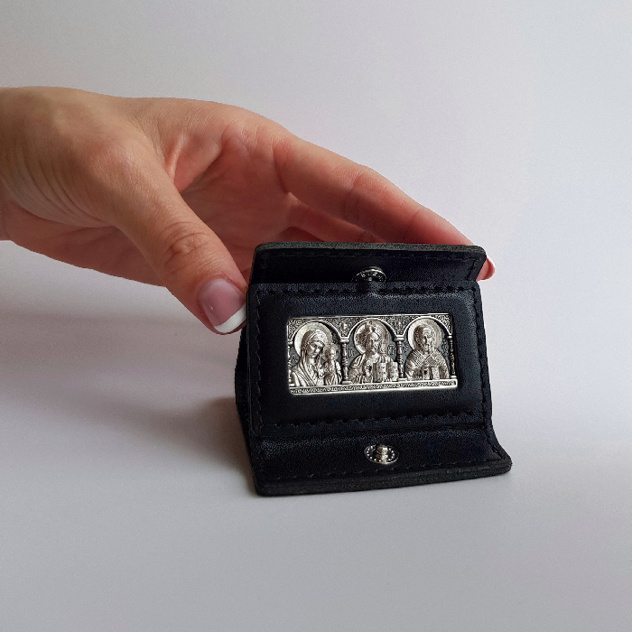 Чехол на кнопке, складывается в «книжку», раскладывается треугольником, как на фото. Внутри молитва «Боже, милостив буде мне грешному». Ручная работа. Бывает черного и темно-коричневого цвета.