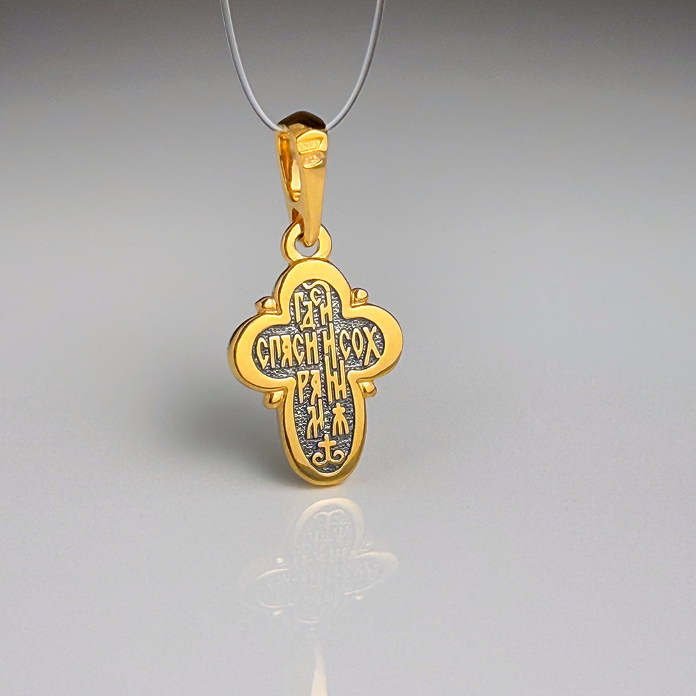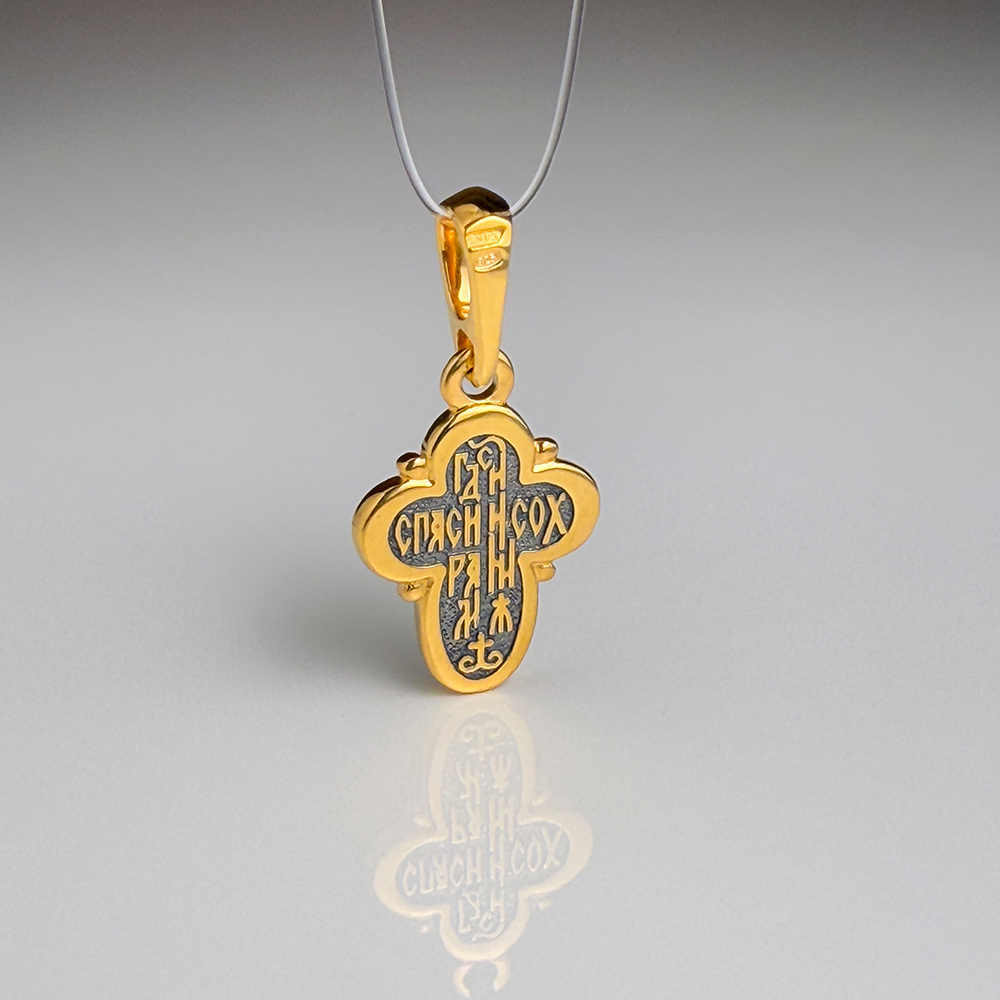 На лицевой стороне изображение Распятого Спасителя в сиянии исходящих лучей. На оборотной стороне молитва-прошение ко Господу.