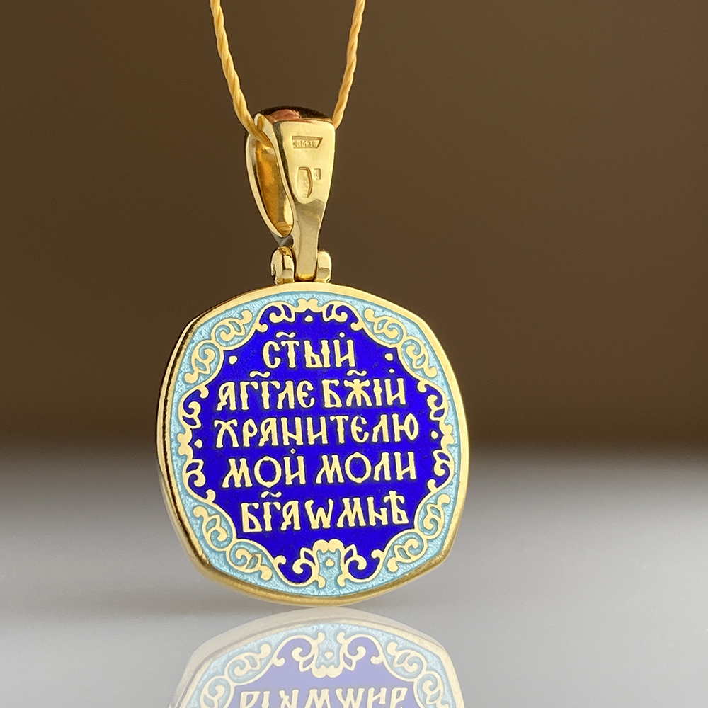 Борт медальона украшен горячей перегородчатой эмалью с растительным орнаментом, что нас отсылает к идее, что икона – окно в Царствие небесное. На оборотной стороне молитва святому Ангелу Хранителю. Покрыто чистым золотом. Освящено полным чином.