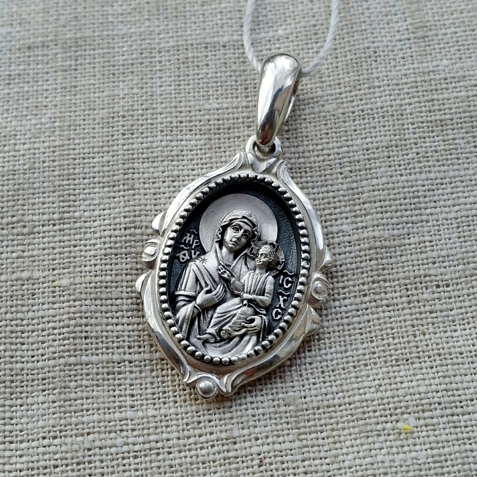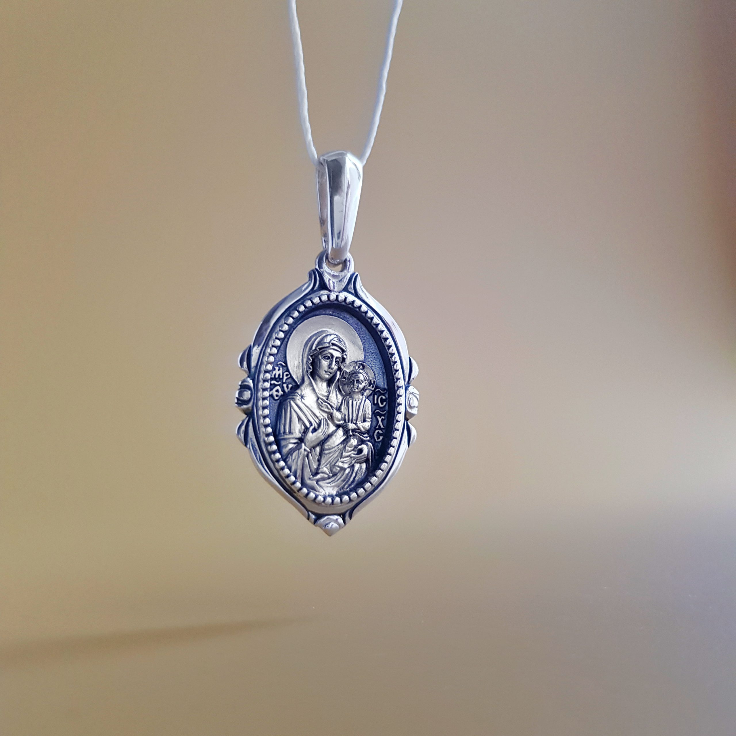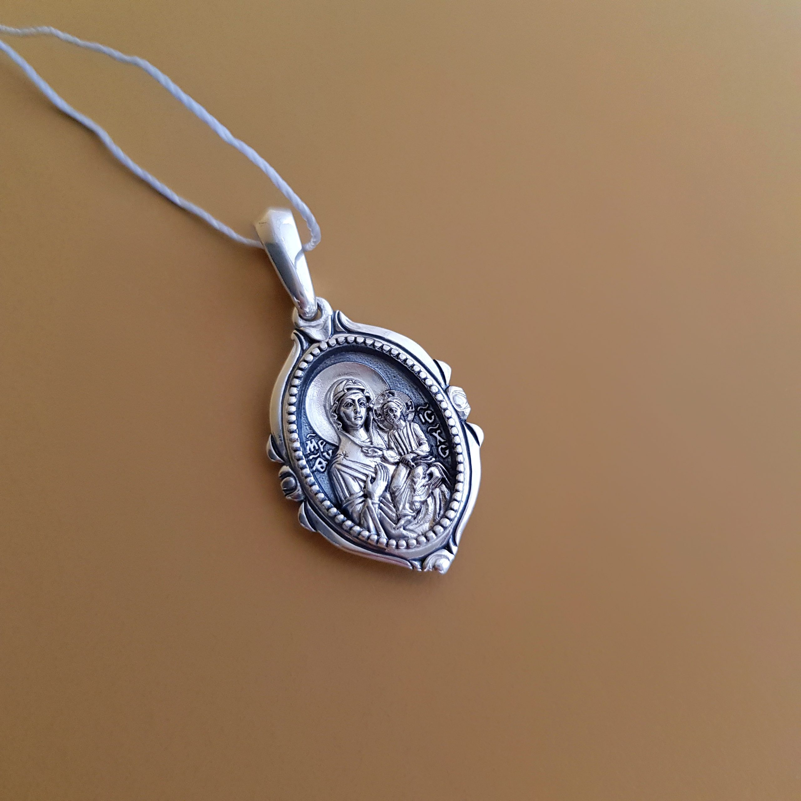Образок-подвеска выполнен в технике мелкой металлопластики. На кулоне