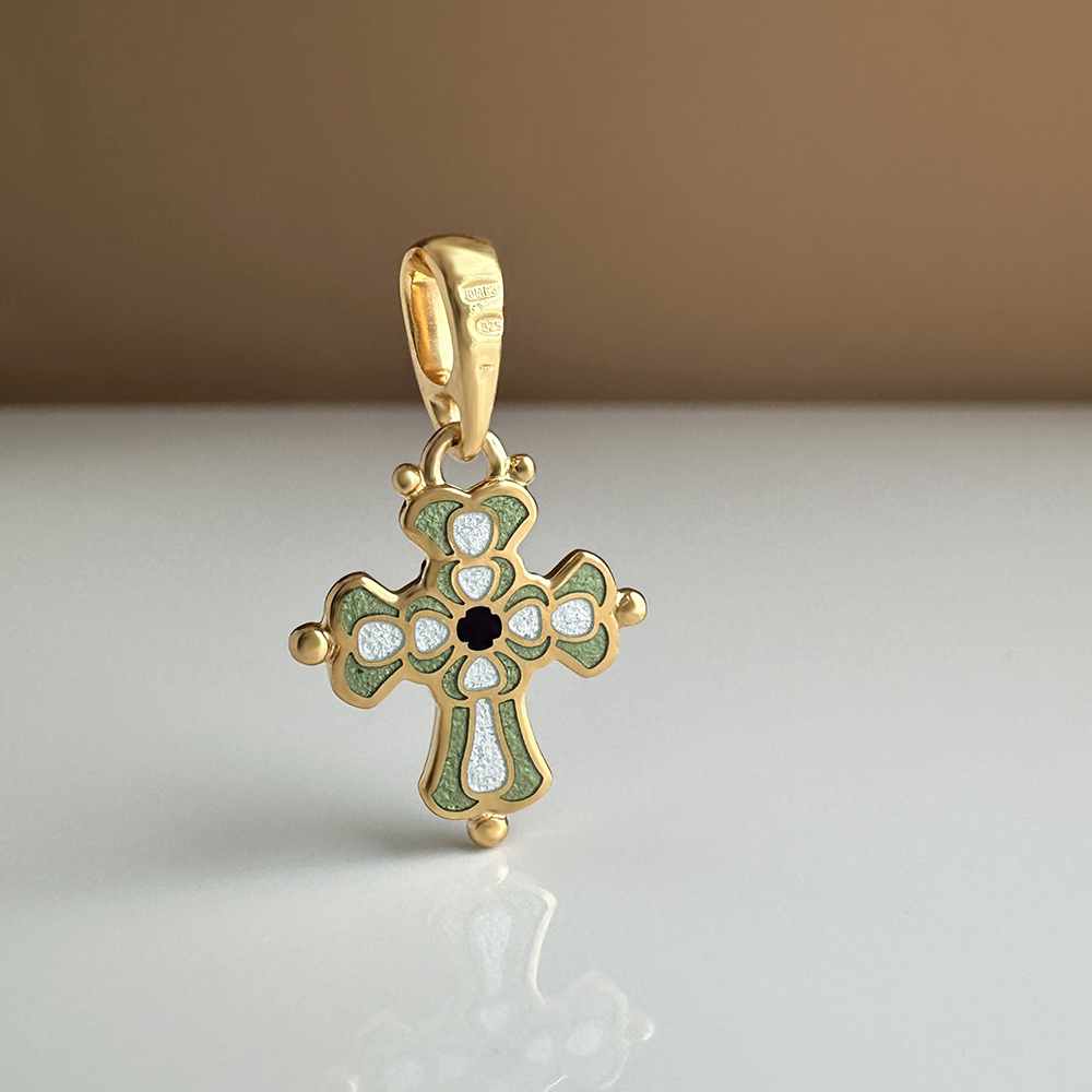 Крест выполнен в технике горячего эмалирования. Эмаль издревле использовалась в церковном прикладном искусстве. В церковной богослужебной практике каждый цвет имеет своё глубинное значение. Поэтому, именно эмаль имеет помимо прочего (изображения, форма, образы…) более глубокое религиозное измерение.