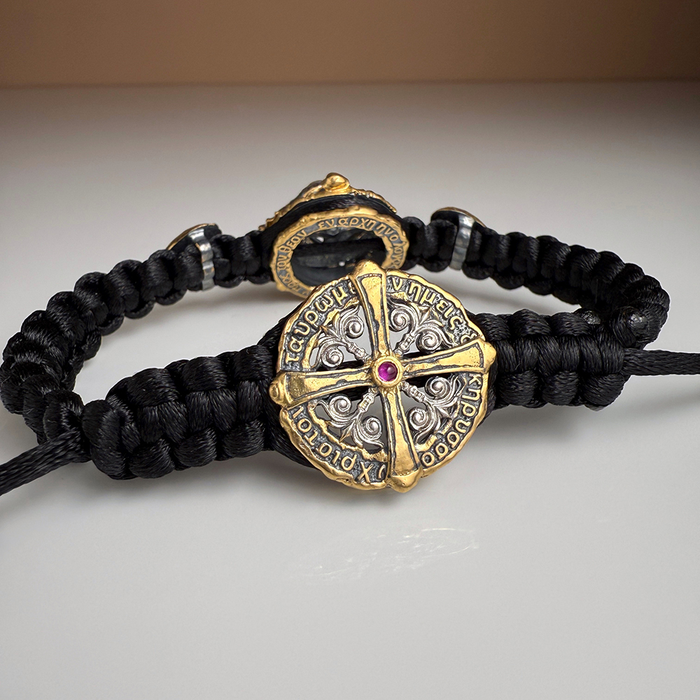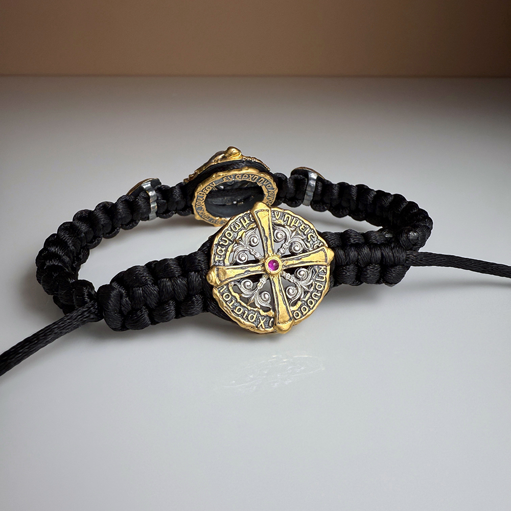 нижней стороне браслета процветший крест с рубиновой каплей в центре, –